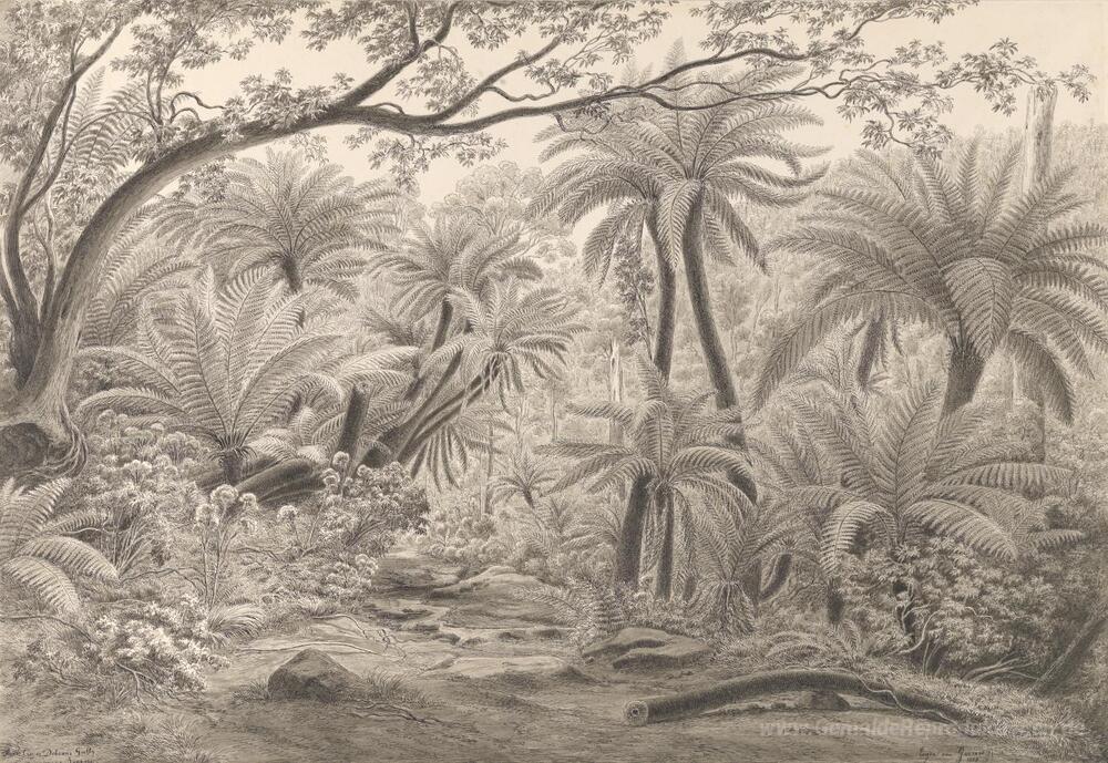 Wir bieten Ihnen eine handgefertigte Reproduktion auf Leinwand des berühmten Kunstwerks 'Ferntree oder Dobson Gully, Dandenong Ranges' von Eugene von Guerard, aus dem Reproduktionsmuseum.