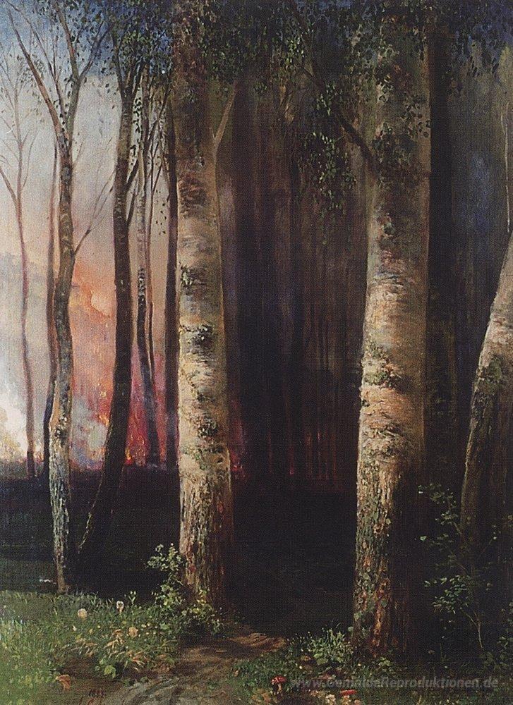 Wir bieten Ihnen eine handgefertigte Reproduktion auf Leinwand des berühmten Kunstwerks 'Feuer im Wald' von Aleksey Savrasov, aus dem Reproduktionsmuseum.