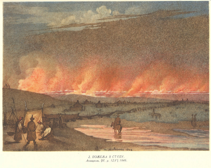 Wir bieten Ihnen eine handgefertigte Reproduktion auf Leinwand des berühmten Kunstwerks 'Feuer in der Steppe' von Taras Shevchenko, aus dem Reproduktionsmuseum.