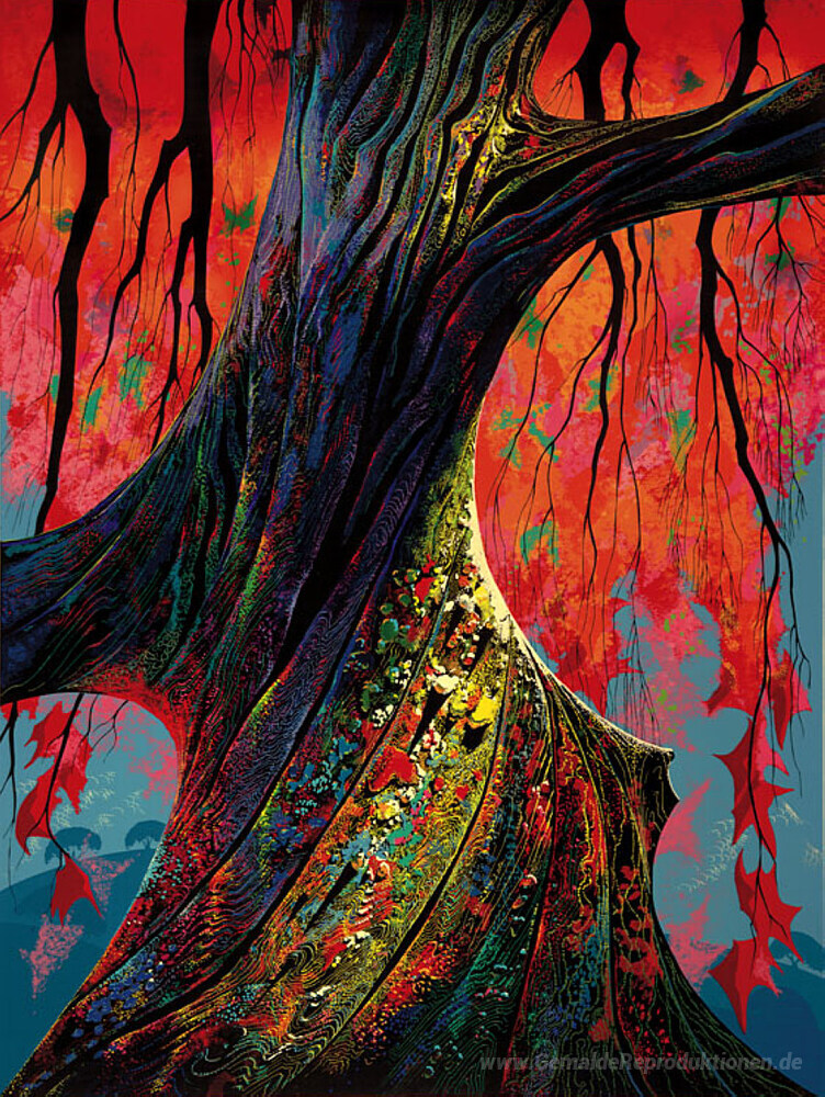Wir bieten Ihnen eine handgefertigte Reproduktion auf Leinwand des berühmten Kunstwerks 'Feuer-Rot-Gold' von Eyvind Earle, aus dem Reproduktionsmuseum.
