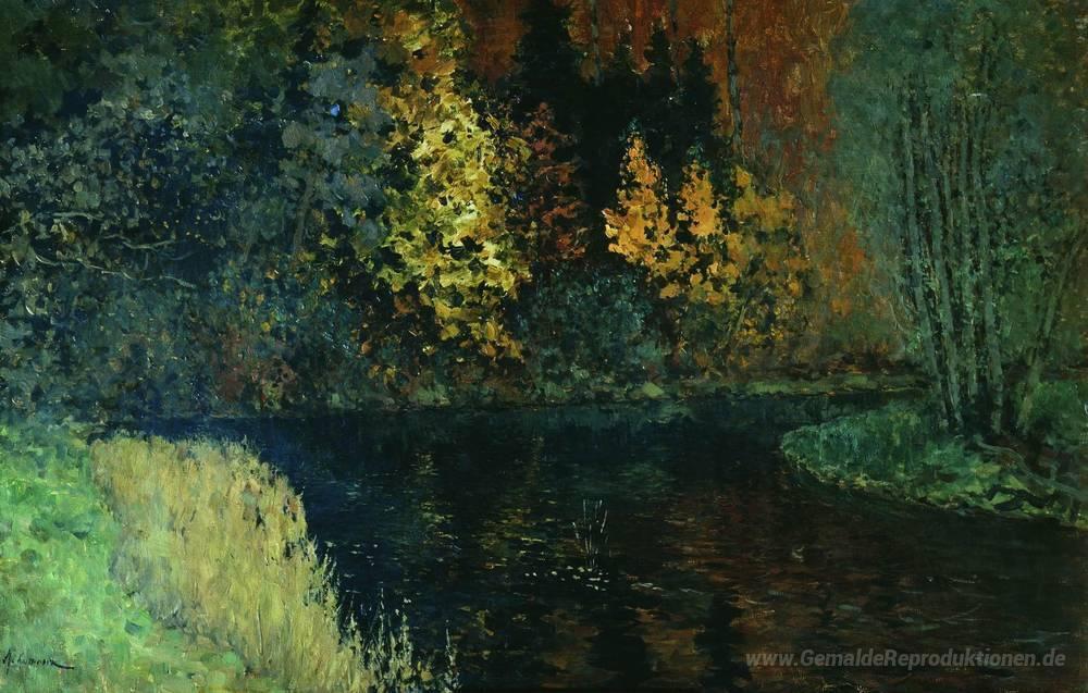 Wir bieten Ihnen eine handgefertigte Reproduktion auf Leinwand des berühmten Kunstwerks 'Fluss in den Wald. Herbst am Fluss Istra.' von Isaac Levitan, aus dem Reproduktionsmuseum.