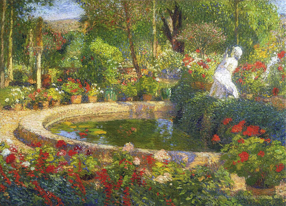 Wir bieten Ihnen eine handgefertigte Reproduktion auf Leinwand des berühmten Kunstwerks 'Fountain in Marquayrol' von Henri Martin, aus dem Reproduktionsmuseum.