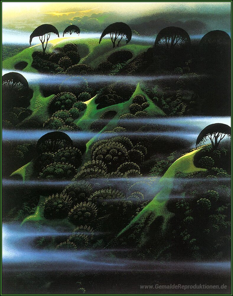 Wir bieten Ihnen eine handgefertigte Reproduktion auf Leinwand des berühmten Kunstwerks 'Früher Morgen-Nebel' von Eyvind Earle, aus dem Reproduktionsmuseum.
