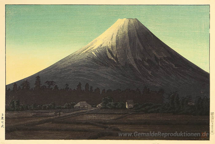 Wir bieten Ihnen eine handgefertigte Reproduktion auf Leinwand des berühmten Kunstwerks 'Fuji in der Nähe Tamaho (grüne Variante)' von Shotei Takahashi, aus dem Reproduktionsmuseum.