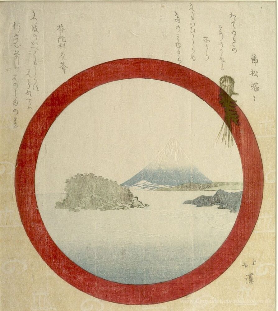 Wir bieten Ihnen eine handgefertigte Reproduktion auf Leinwand des berühmten Kunstwerks 'Fuji und Enoshima durch ein rundes FENSTER' von Toyota Hokkei, aus dem Reproduktionsmuseum.