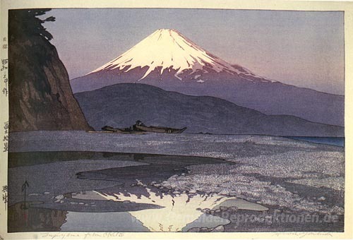 Wir bieten Ihnen eine handgefertigte Reproduktion auf Leinwand des berühmten Kunstwerks 'Fujiyama von Okitsu' von Hiroshi Yoshida, aus dem Reproduktionsmuseum.