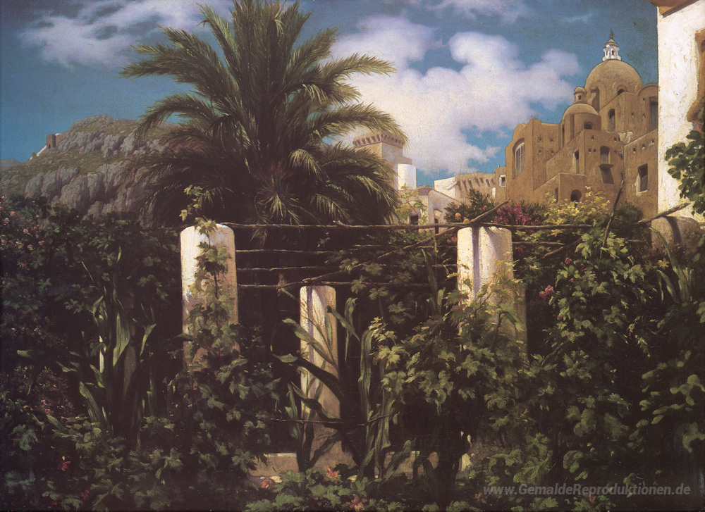 Wir bieten Ihnen eine handgefertigte Reproduktion auf Leinwand des berühmten Kunstwerks 'Garten eines Capri Inn' von Frederic Leighton, aus dem Reproduktionsmuseum.
