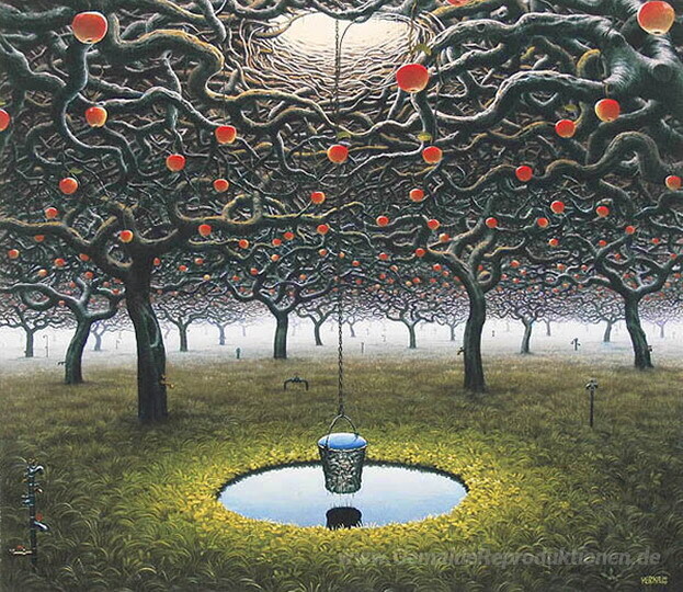 Wir bieten Ihnen eine handgefertigte Reproduktion auf Leinwand des berühmten Kunstwerks 'Garten' von Jacek Yerka, aus dem Reproduktionsmuseum.