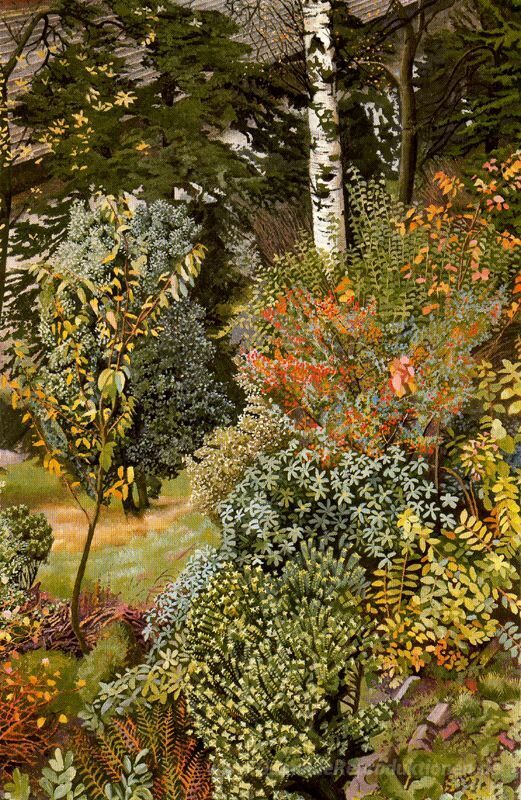 Wir bieten Ihnen eine handgefertigte Reproduktion auf Leinwand des berühmten Kunstwerks 'Garten-Szene. Port Glasgow.' von Stanley Spencer, aus dem Reproduktionsmuseum.