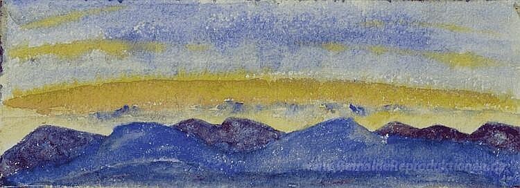 Wir bieten Ihnen eine handgefertigte Reproduktion auf Leinwand des berühmten Kunstwerks 'Gebirgskette bei Sonnenuntergang' von Cuno Amiet, aus dem Reproduktionsmuseum.