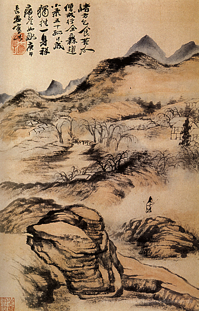 Wir bieten Ihnen eine handgefertigte Reproduktion auf Leinwand des berühmten Kunstwerks 'Gehen Sie durch den kalten Pfaden' von Shitao, aus dem Reproduktionsmuseum.