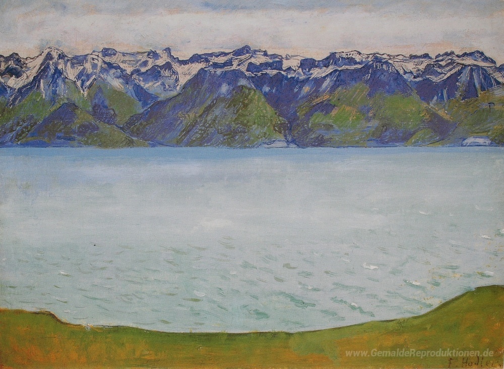 Wir bieten Ihnen eine handgefertigte Reproduktion auf Leinwand des berühmten Kunstwerks 'Genfer See mit Savoyerbergen' von Ferdinand Hodler, aus dem Reproduktionsmuseum.