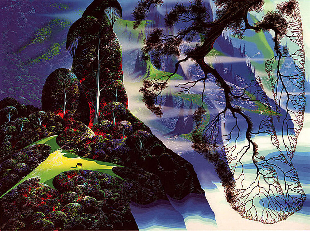 Wir bieten Ihnen eine handgefertigte Reproduktion auf Leinwand des berühmten Kunstwerks 'Gottes Land' von Eyvind Earle, aus dem Reproduktionsmuseum.