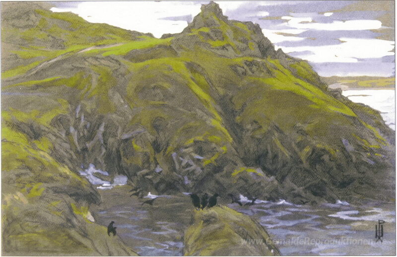 Wir bieten Ihnen eine handgefertigte Reproduktion auf Leinwand des berühmten Kunstwerks 'Grün Fjord' von Nicholas Roerich, aus dem Reproduktionsmuseum.