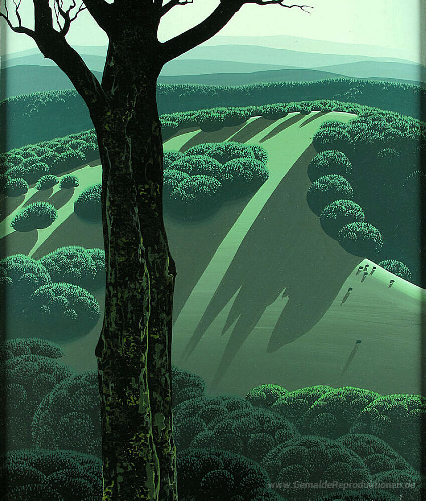 Wir bieten Ihnen eine handgefertigte Reproduktion auf Leinwand des berühmten Kunstwerks 'Grünen Hügel' von Eyvind Earle, aus dem Reproduktionsmuseum.