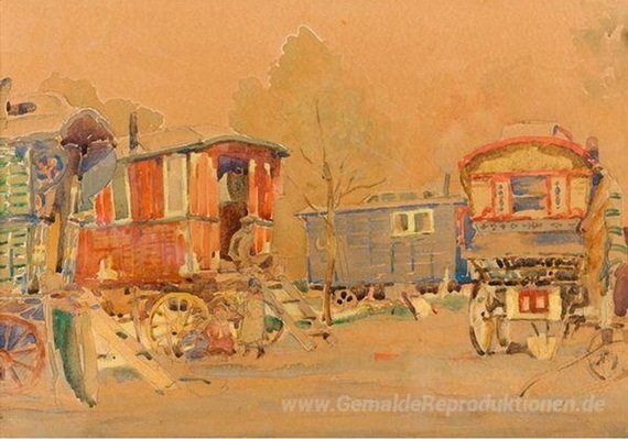 Wir bieten Ihnen eine handgefertigte Reproduktion auf Leinwand des berühmten Kunstwerks 'Guildford Gypsies' von Walter Battiss, aus dem Reproduktionsmuseum.