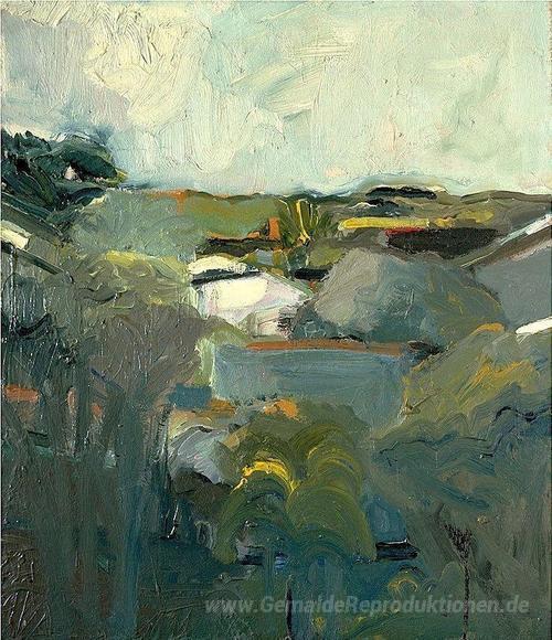 Wir bieten Ihnen eine handgefertigte Reproduktion auf Leinwand des berühmten Kunstwerks 'Häuser und Hügel' von Elmer Bischoff, aus dem Reproduktionsmuseum.