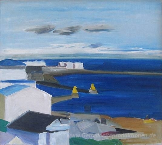 Wir bieten Ihnen eine handgefertigte Reproduktion auf Leinwand des berühmten Kunstwerks 'Harbor Scene, Reykjavik II' von Louisa Matthiasdottir, aus dem Reproduktionsmuseum.