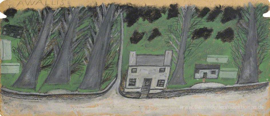 Wir bieten Ihnen eine handgefertigte Reproduktion auf Leinwand des berühmten Kunstwerks 'Haus mit Bäumen' von Alfred Wallis, aus dem Reproduktionsmuseum.