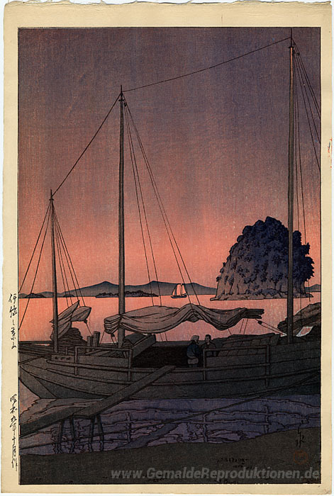 Wir bieten Ihnen eine handgefertigte Reproduktion auf Leinwand des berühmten Kunstwerks 'Hayama, Iyo' von Hasui Kawase, aus dem Reproduktionsmuseum.