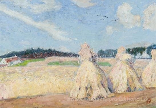 Wir bieten Ihnen eine handgefertigte Reproduktion auf Leinwand des berühmten Kunstwerks 'Haystacks' von Gustave de Smet, aus dem Reproduktionsmuseum.