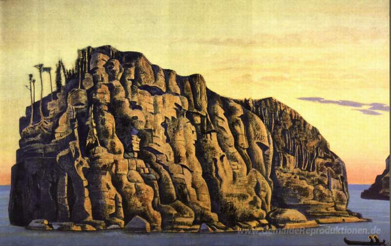 Wir bieten Ihnen eine handgefertigte Reproduktion auf Leinwand des berühmten Kunstwerks 'Heilige Insel' von Nicholas Roerich, aus dem Reproduktionsmuseum.