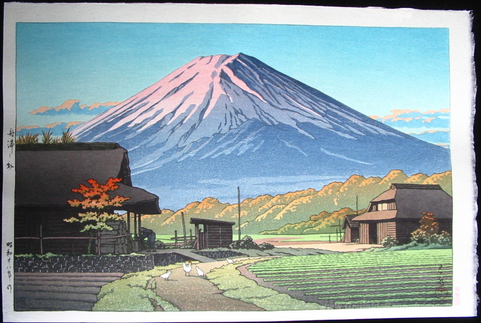Wir bieten Ihnen eine handgefertigte Reproduktion auf Leinwand des berühmten Kunstwerks 'Herbst an Funatsu, Nähe See Kawaguchi' von Hasui Kawase, aus dem Reproduktionsmuseum.