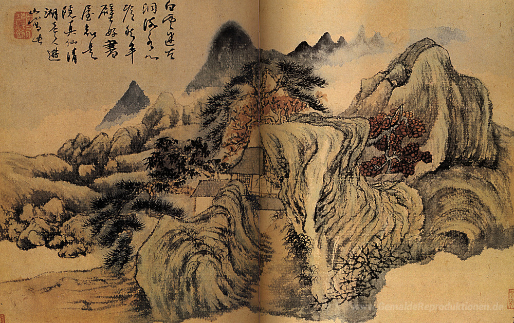 Wir bieten Ihnen eine handgefertigte Reproduktion auf Leinwand des berühmten Kunstwerks 'Herbst der Berg' von Shitao, aus dem Reproduktionsmuseum.
