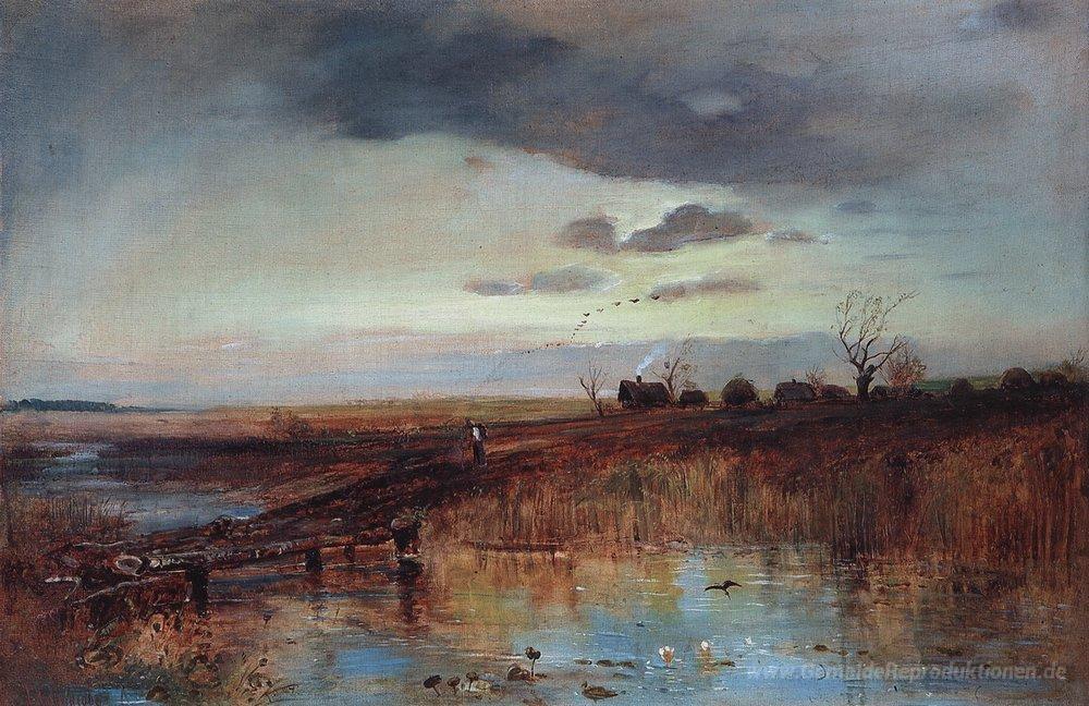 Wir bieten Ihnen eine handgefertigte Reproduktion auf Leinwand des berühmten Kunstwerks 'Herbst. Dorf in der Nähe des Baches' von Aleksey Savrasov, aus dem Reproduktionsmuseum.