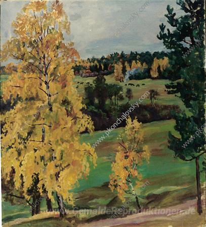 Wir bieten Ihnen eine handgefertigte Reproduktion auf Leinwand des berühmten Kunstwerks 'Herbst. Gelb Holz.' von Pyotr Konchalovsky, aus dem Reproduktionsmuseum.