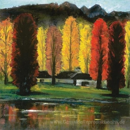 Wir bieten Ihnen eine handgefertigte Reproduktion auf Leinwand des berühmten Kunstwerks 'Herbst-Dämmerung in einem Wald' von Lin Fengmian, aus dem Reproduktionsmuseum.