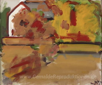 Wir bieten Ihnen eine handgefertigte Reproduktion auf Leinwand des berühmten Kunstwerks 'Herbst-Landschaft mit Haus' von Robert De Niro, Sr., aus dem Reproduktionsmuseum.