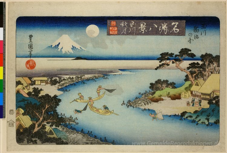 Wir bieten Ihnen eine handgefertigte Reproduktion auf Leinwand des berühmten Kunstwerks 'Herbstmond in Tamagawa, zwei Boote Angeln in der Nacht' von Utagawa Toyokuni II, aus dem Reproduktionsmuseum.