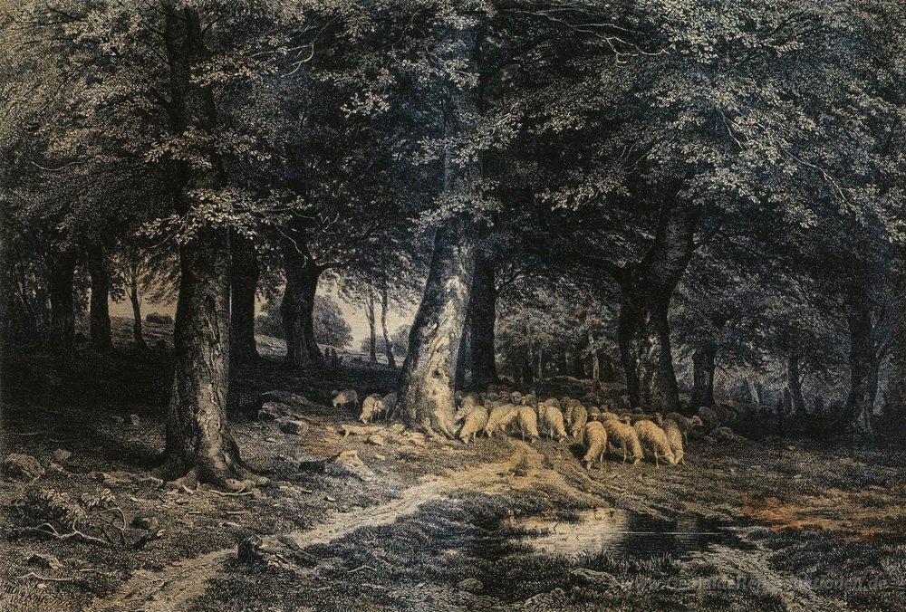 Wir bieten Ihnen eine handgefertigte Reproduktion auf Leinwand des berühmten Kunstwerks 'Herde von Schafen in den Wald' von Ivan Shishkin, aus dem Reproduktionsmuseum.