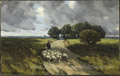 Wir bieten Ihnen eine handgefertigte Reproduktion auf Leinwand des berühmten Kunstwerks 'Herding Sheep' von Homer Watson, aus dem Reproduktionsmuseum.
