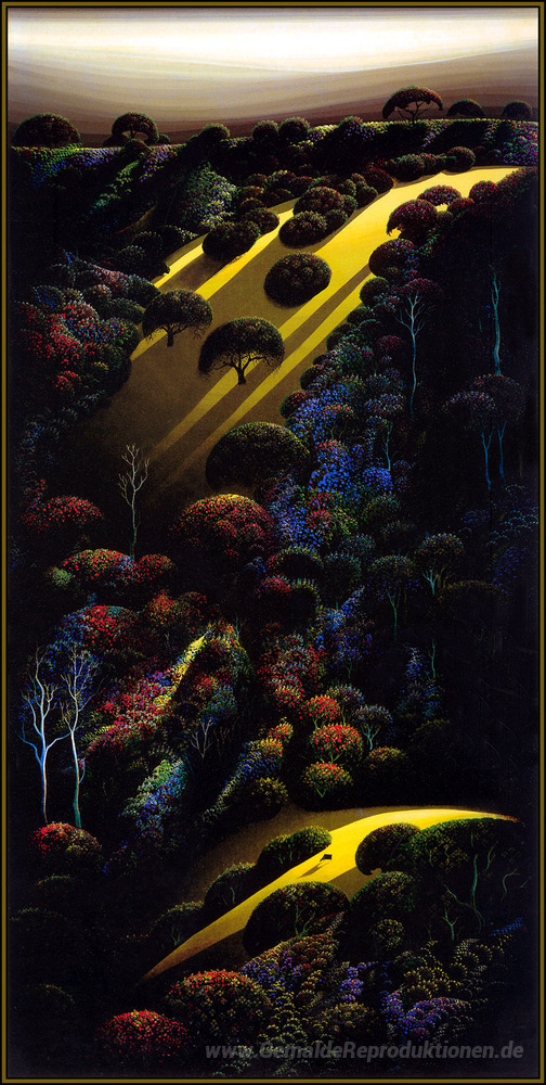 Wir bieten Ihnen eine handgefertigte Reproduktion auf Leinwand des berühmten Kunstwerks 'Hillside Magie' von Eyvind Earle, aus dem Reproduktionsmuseum.