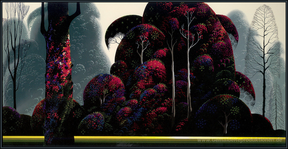 Wir bieten Ihnen eine handgefertigte Reproduktion auf Leinwand des berühmten Kunstwerks 'Hochrot Eucalyptus' von Eyvind Earle, aus dem Reproduktionsmuseum.