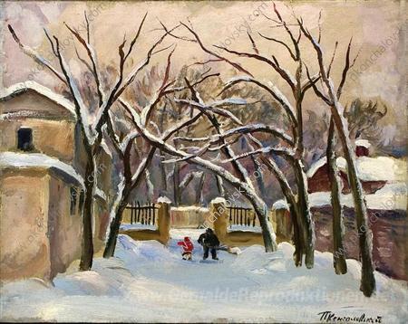 Wir bieten Ihnen eine handgefertigte Reproduktion auf Leinwand des berühmten Kunstwerks 'Hof Samarins 'House on Spiridonovka' von Pyotr Konchalovsky, aus dem Reproduktionsmuseum.