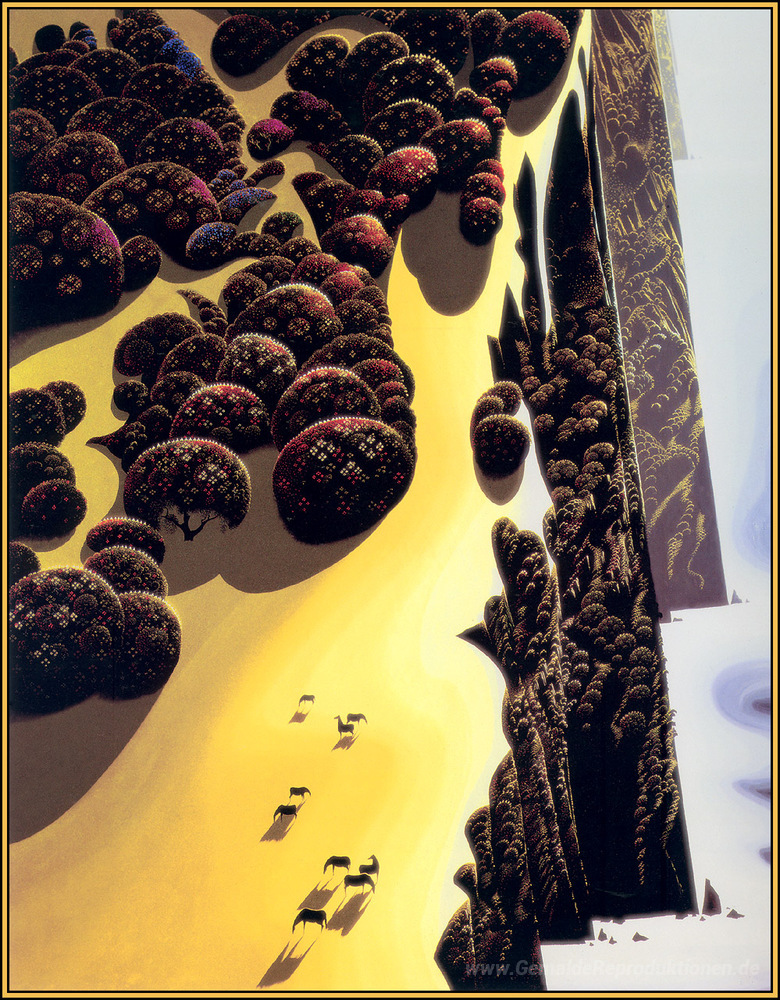 Wir bieten Ihnen eine handgefertigte Reproduktion auf Leinwand des berühmten Kunstwerks 'Horses by the Sea' von Eyvind Earle, aus dem Reproduktionsmuseum.