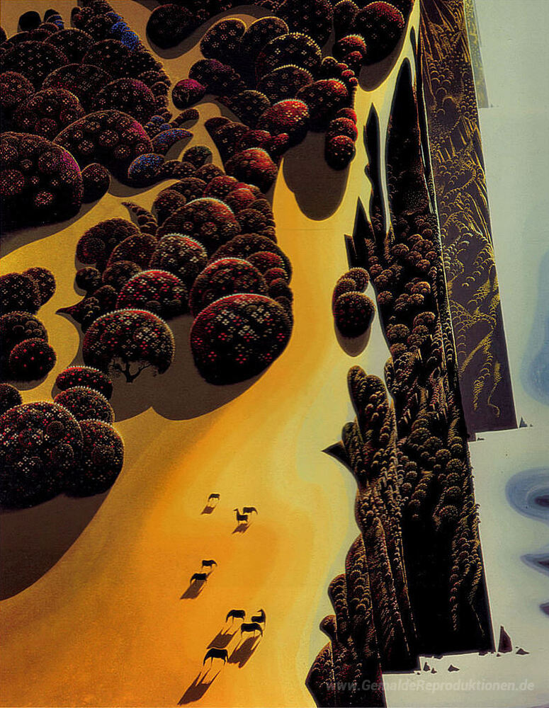 Entdecken Sie die faszinierende Welt der Ölgemälde mit unserem Meisterwerk „Horses by the Sea“ von Eyvind Earle. Dieser herausragende Künstler ist bekannt für seinen unverwechselbaren Stil, der in jedem Pinselstrich die Schönheit der Natur einfängt. Inspired by the magnificent landscapes of California, verbindet Earle in seinen Werken lebendige Farben mit einer harmonischen Komposition, die den Betrachter sofort in ihren Bann zieht.
