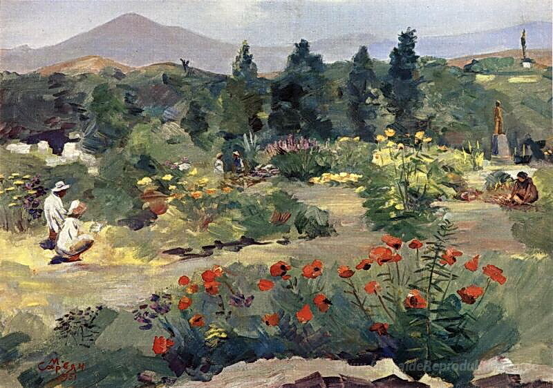 Wir bieten Ihnen eine handgefertigte Reproduktion auf Leinwand des berühmten Kunstwerks 'Im Botanischen Garten' von Martiros Saryan, aus dem Reproduktionsmuseum.