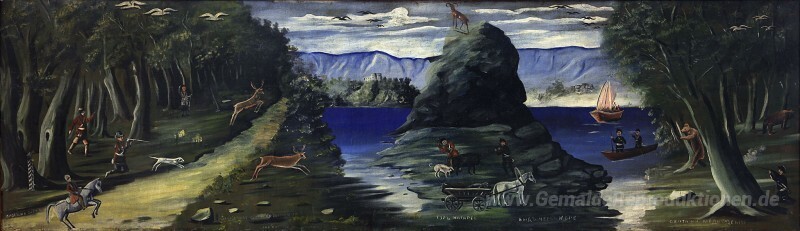 Wir bieten Ihnen eine handgefertigte Reproduktion auf Leinwand des berühmten Kunstwerks 'Jagdszene mit Blick auf das Schwarze Meer' von Niko Pirosmani, aus dem Reproduktionsmuseum.