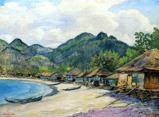 Wir bieten Ihnen eine handgefertigte Reproduktion auf Leinwand des berühmten Kunstwerks 'Japanese Village' von David Burliuk, aus dem Reproduktionsmuseum.