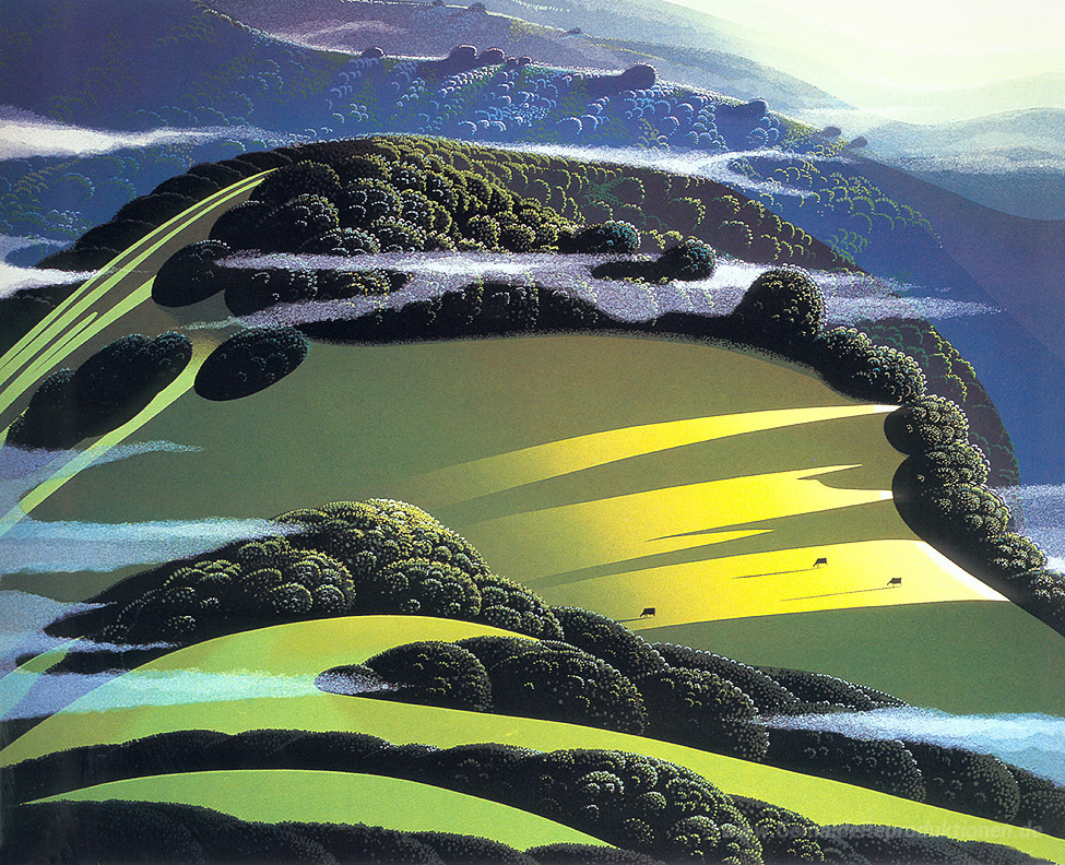 Wir bieten Ihnen eine handgefertigte Reproduktion auf Leinwand des berühmten Kunstwerks 'Jenseits des Tals' von Eyvind Earle, aus dem Reproduktionsmuseum.