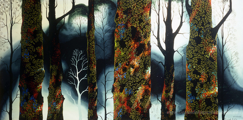 Wir bieten Ihnen eine handgefertigte Reproduktion auf Leinwand des berühmten Kunstwerks 'Jewel Bäume' von Eyvind Earle, aus dem Reproduktionsmuseum.