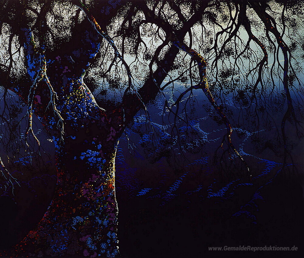 Wir bieten Ihnen eine handgefertigte Reproduktion auf Leinwand des berühmten Kunstwerks 'Jewel Baum' von Eyvind Earle, aus dem Reproduktionsmuseum.