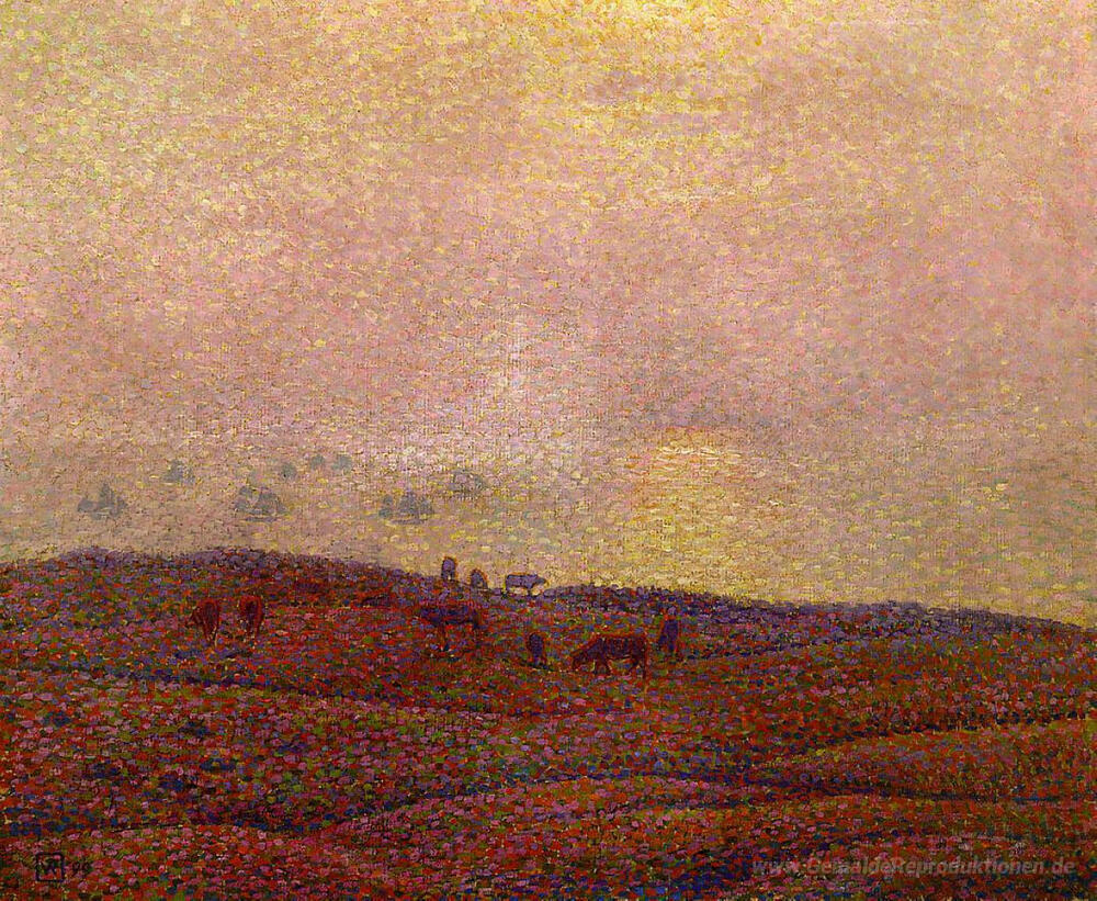 Wir bieten Ihnen eine handgefertigte Reproduktion auf Leinwand des berühmten Kunstwerks 'Kühe in einer Landschaft' von Theo van Rysselberghe, aus dem Reproduktionsmuseum.