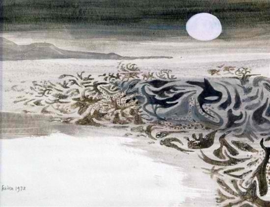 Wir bieten Ihnen eine handgefertigte Reproduktion auf Leinwand des berühmten Kunstwerks 'Küstenlandschaft' von Mary Fedden, aus dem Reproduktionsmuseum.
