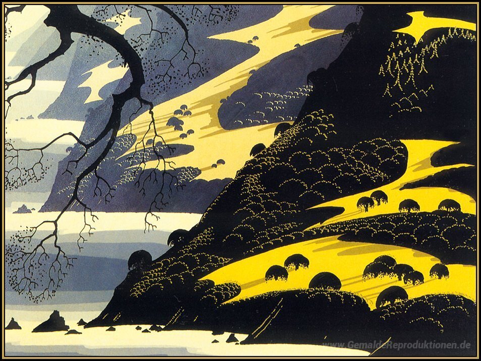Wir bieten Ihnen eine handgefertigte Reproduktion auf Leinwand des berühmten Kunstwerks 'Küstennebel' von Eyvind Earle, aus dem Reproduktionsmuseum.