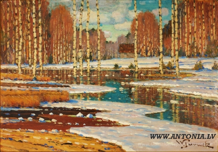 Wir bieten Ihnen eine handgefertigte Reproduktion auf Leinwand des berühmten Kunstwerks 'Kūstošais sniegs' von Vilhelms Purvitis, aus dem Reproduktionsmuseum.